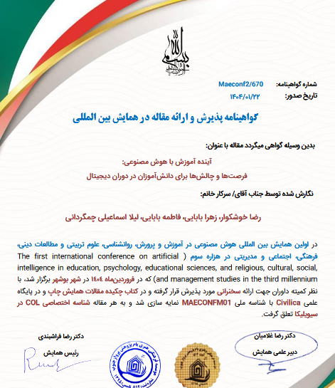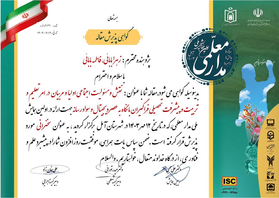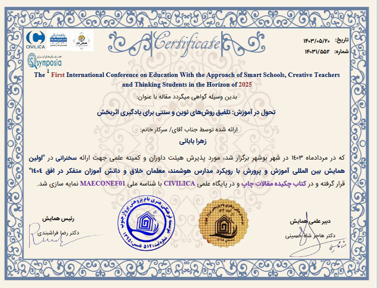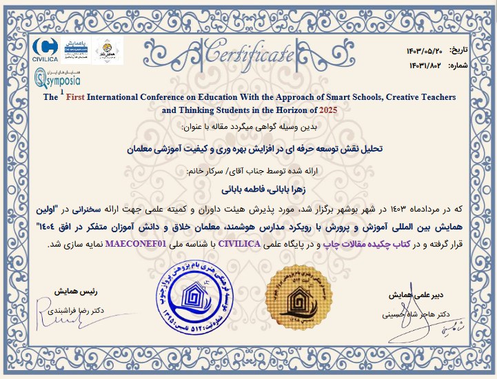 مشخصات نویسنده مقاله نقش فناوری و فضای مجازی در تعلیم و تربیتبابایی - معلم آموزش و پرورش آدرس لینک مقاله ام : http://www.civilica.com/Paper-CPESCONF03-CPESCONF03_051.html چکیده مقاله ام: دنياي اشباع امروز با انواع فناوري ها و بخصوص فضاي مجازي از عمده ابزارها و مهم ترين وسايل ارتباطي... برچسبها: مقاله ام در همایش ادامه مطلب [ چهارشنبه ۱۳۹۹/۰۱/۲۰ ] [ 9:23 ] [ بابايي ]